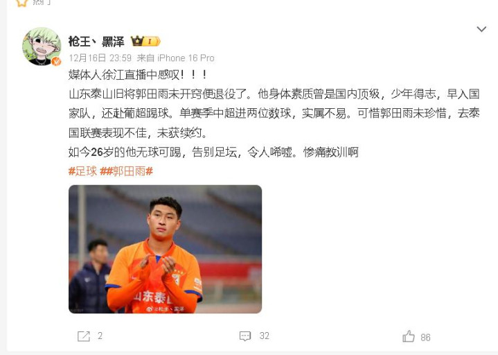 媒体人徐江在直播中那声沉重的叹息,如同一记重锤,狠狠砸在每一位关注中国足球的球迷心上,为什么这样说?“山东泰山旧将郭田雨还没开窍就退役了!”年仅26岁,本应是足球生涯黄金期的郭田雨,却要无奈告别绿茵场,这背后究竟藏着多少不为人知的隐情与教训?