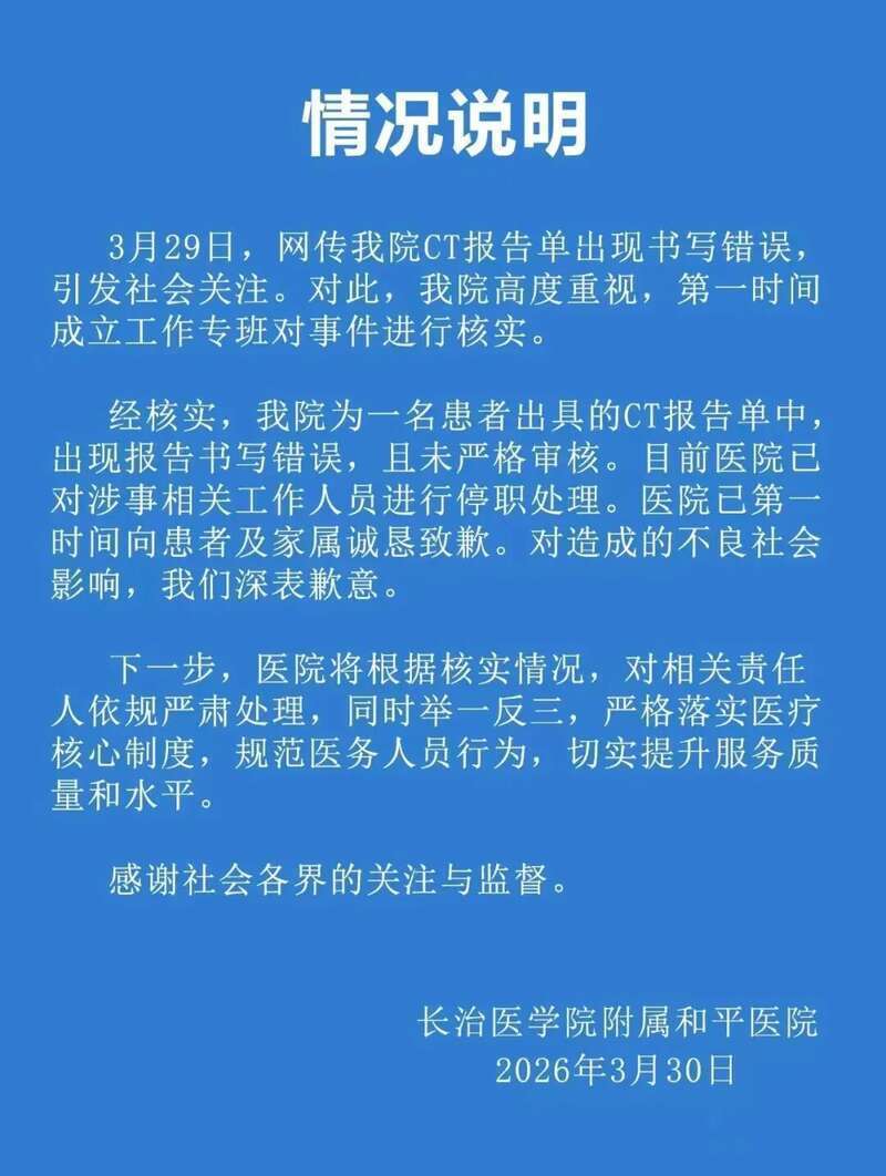 3月30日,长治医学院附属和平医院发布“情况说明”称,经核实,该院为一名患者出具的CT报告单中,出现报告书写错误,且未严格审核。目前,医院已对涉事相关工作人员进行停职处理,并向患者及家属诚恳致歉,对造成的不良社会影响深表歉意。