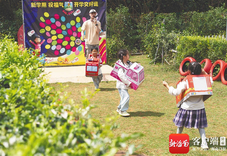 小朋友模拟汽车,在荷爱文的指挥下“行驶”。海南日报全媒体记者 袁琛 摄